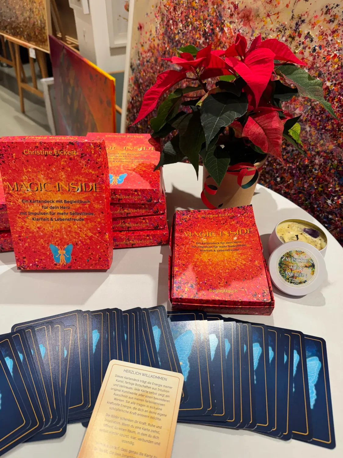 Christine ist Künstlerin und sie malt wunderschöne, ausdrucksstarke Bilder. Für ihre Karten hat sie zusätzlich mit Hilfe des Kurses ein ergänzendes Begleitbuch entworfen und drucken lassen.